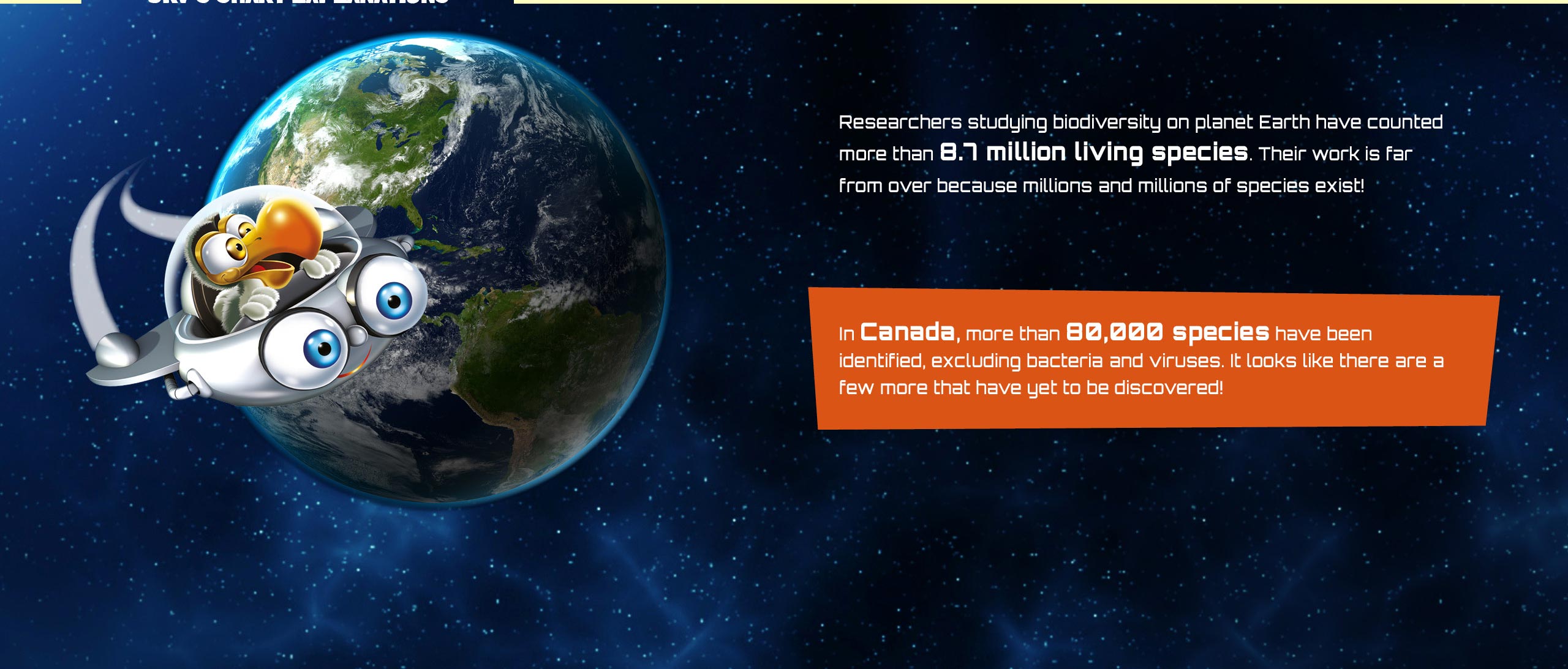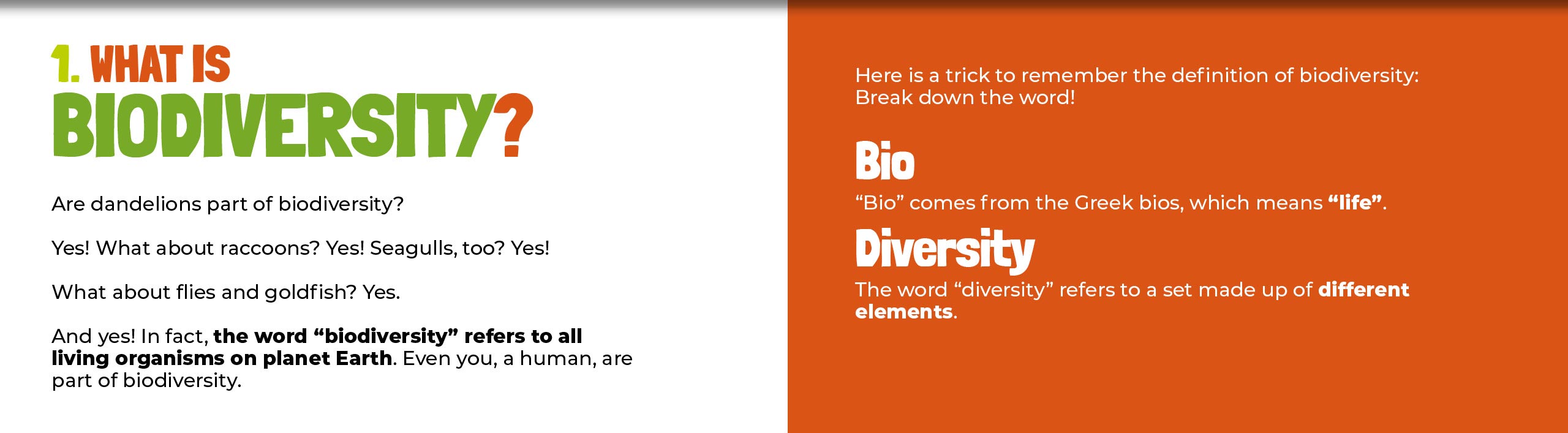 WHO IS COSMO? 1. WHAT IS BIODIVERSITY? 2. AN OVERVIEW OF LIVING BEINGS ON EARTH 3. THE IMPORTANCE OF BIODIVERSITY 4. THE EROSION OF BIODIVERSITY 5. CONNECT WITH NATURE 6. SPY ON THE FLORA AND FAUNA 7. ATTRACT POLLINATORS 8. REDUCE YOUR ENVIRONMENTAL IMPACT 9. MANAGE YOUR WASTE 10. ESTABLISH ECOLOGICAL CORRIDORS 11. PRESERVE NATIVE SPECIES 12. PROMOTE HEALTHY HABITS 13. READY FOR THE QUIZ! WHO IS COSMO? 1. WHAT IS BIODIVERSITY? 2. AN OVERVIEW OF LIVING BEINGS ON EARTH 3. THE IMPORTANCE OF BIODIVERSITY 4. THE EROSION OF BIODIVERSITY 5. CONNECT WITH NATURE 6. SPY ON THE FLORA AND FAUNA 7. ATTRACT POLLINATORS 8. REDUCE YOUR ENVIRONMENTAL IMPACT 9. MANAGE YOUR WASTE 10. ESTABLISH ECOLOGICAL CORRIDORS 11. PRESERVE NATIVE SPECIES 12. PROMOTE HEALTHY HABITS 13. READY FOR THE QUIZ! Continue: 2. AN OVERVIEW OF LIVING BEINGS ON EARTH